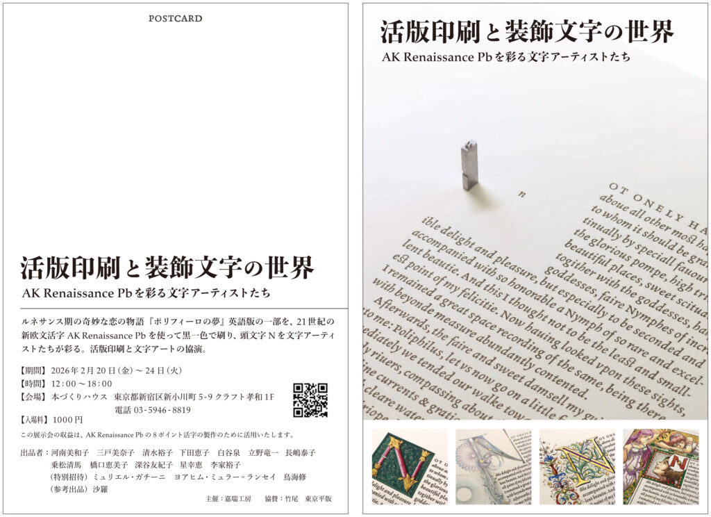 この展示会の収益はAK Renaissance Pbの8ポイント活字製作のために活用いたします。