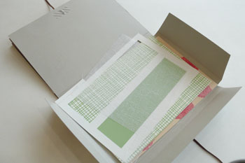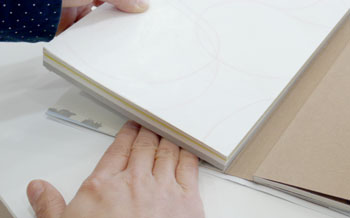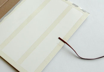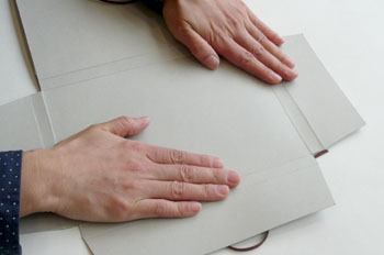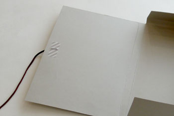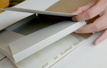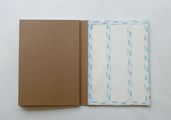 2.見返しに両面テープを貼ります。 見返しの四方と真ん中に両面テープを貼ります。 |